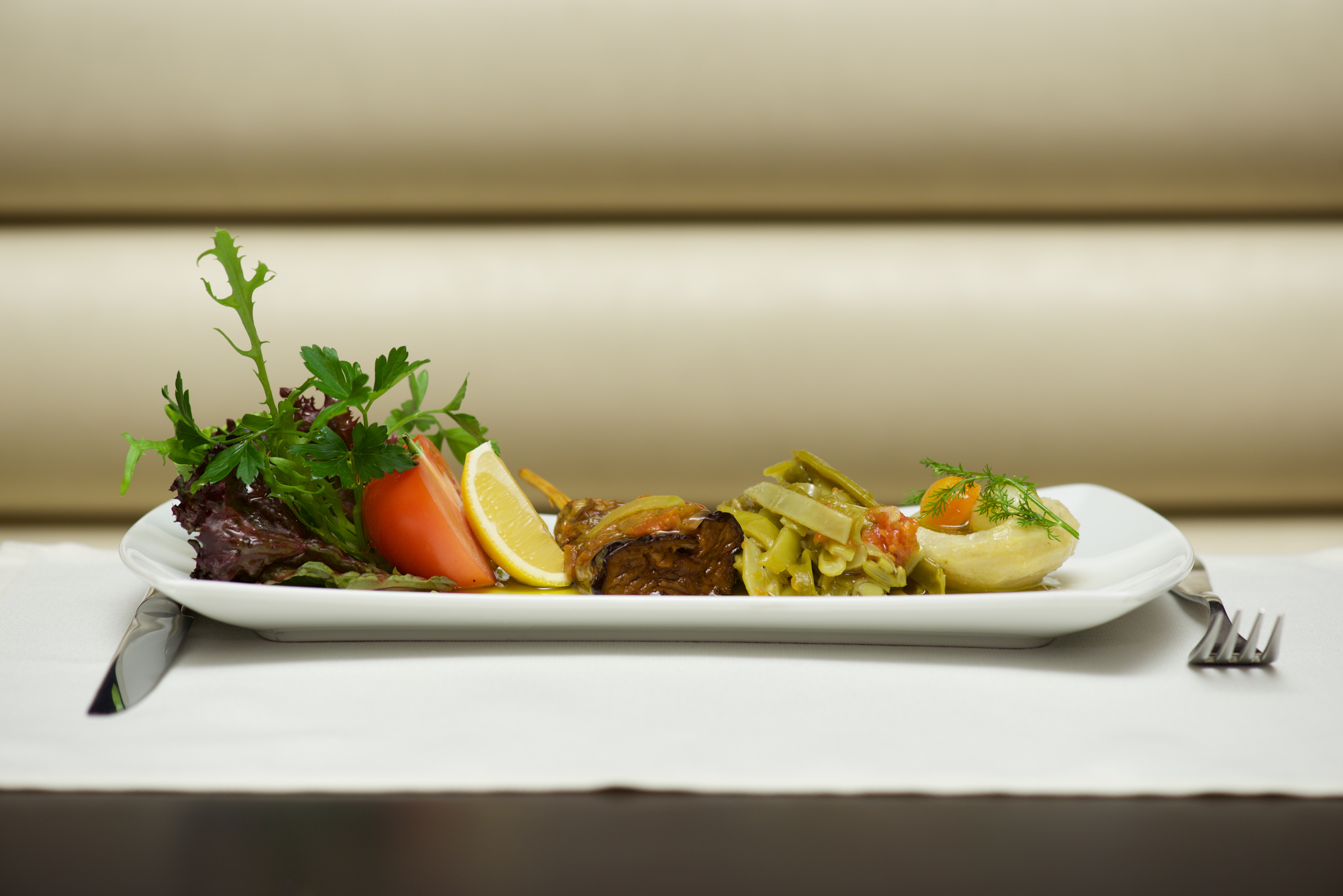 Published January 16, 2015 at 7267 × 4850 in Aegean-style vegetables on white plate with cutlery.