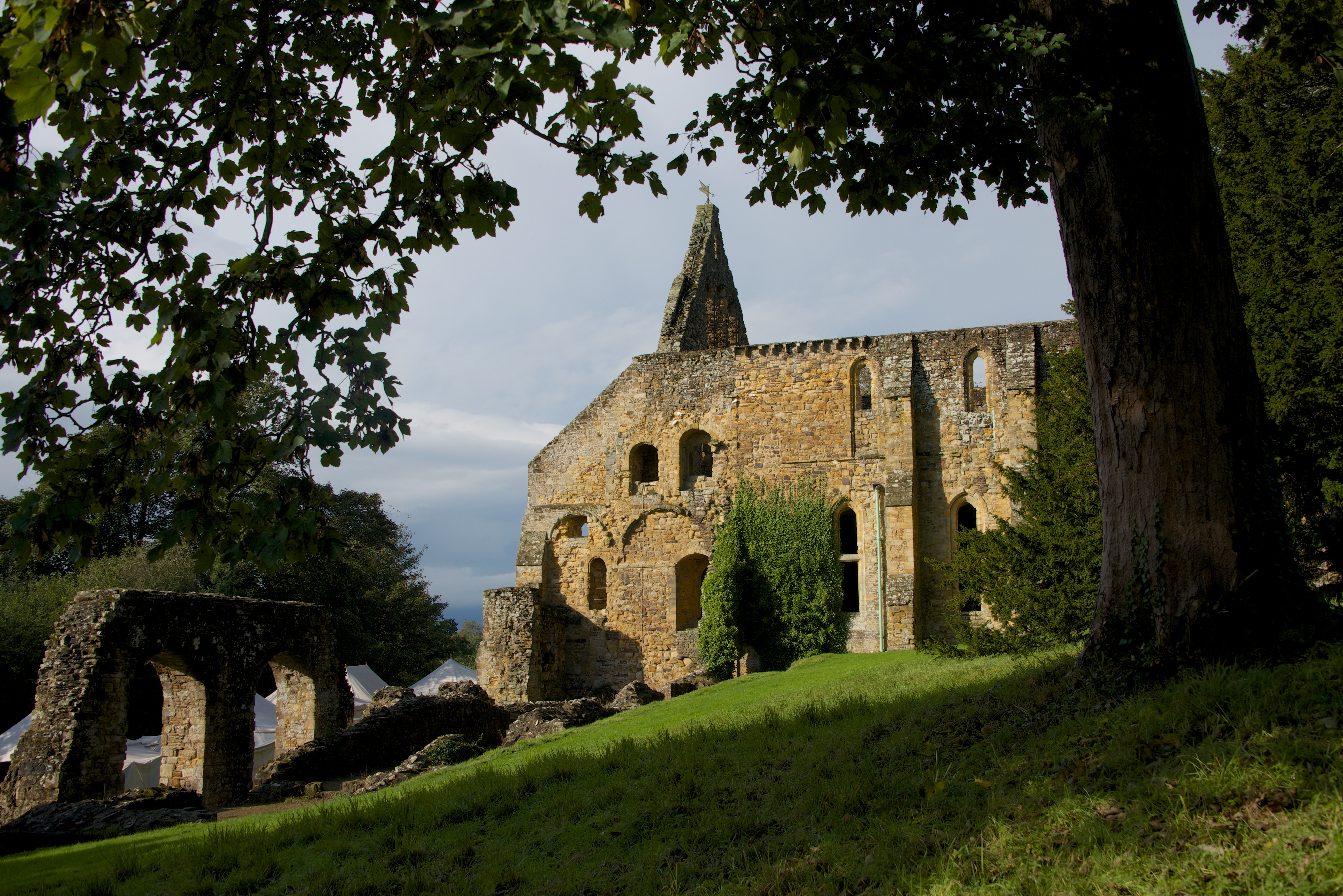 Battle Abbey ruins framed by tree branches