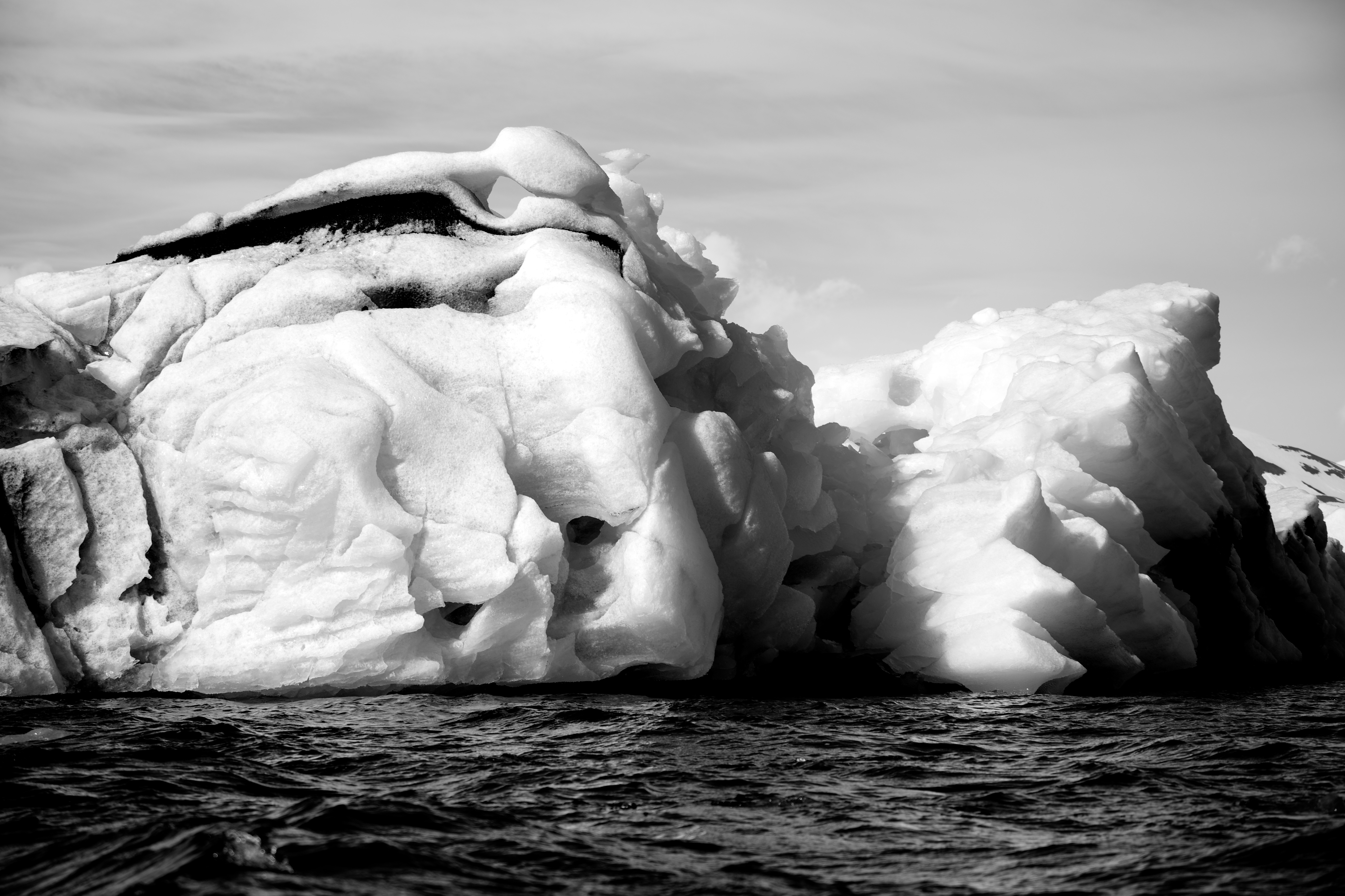 Black and white icebergs in Arctic Ocean