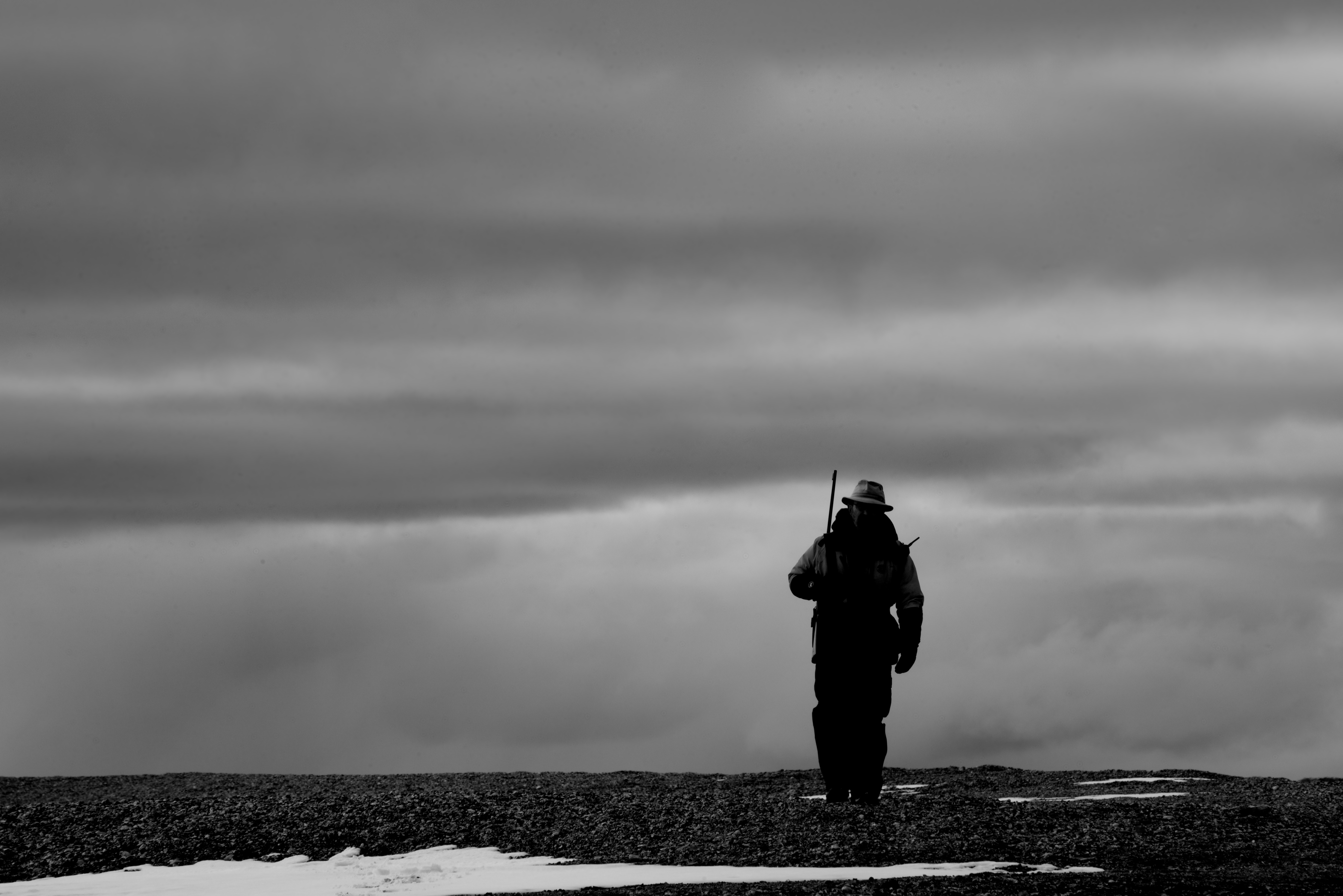 Black and white man walking with rifle