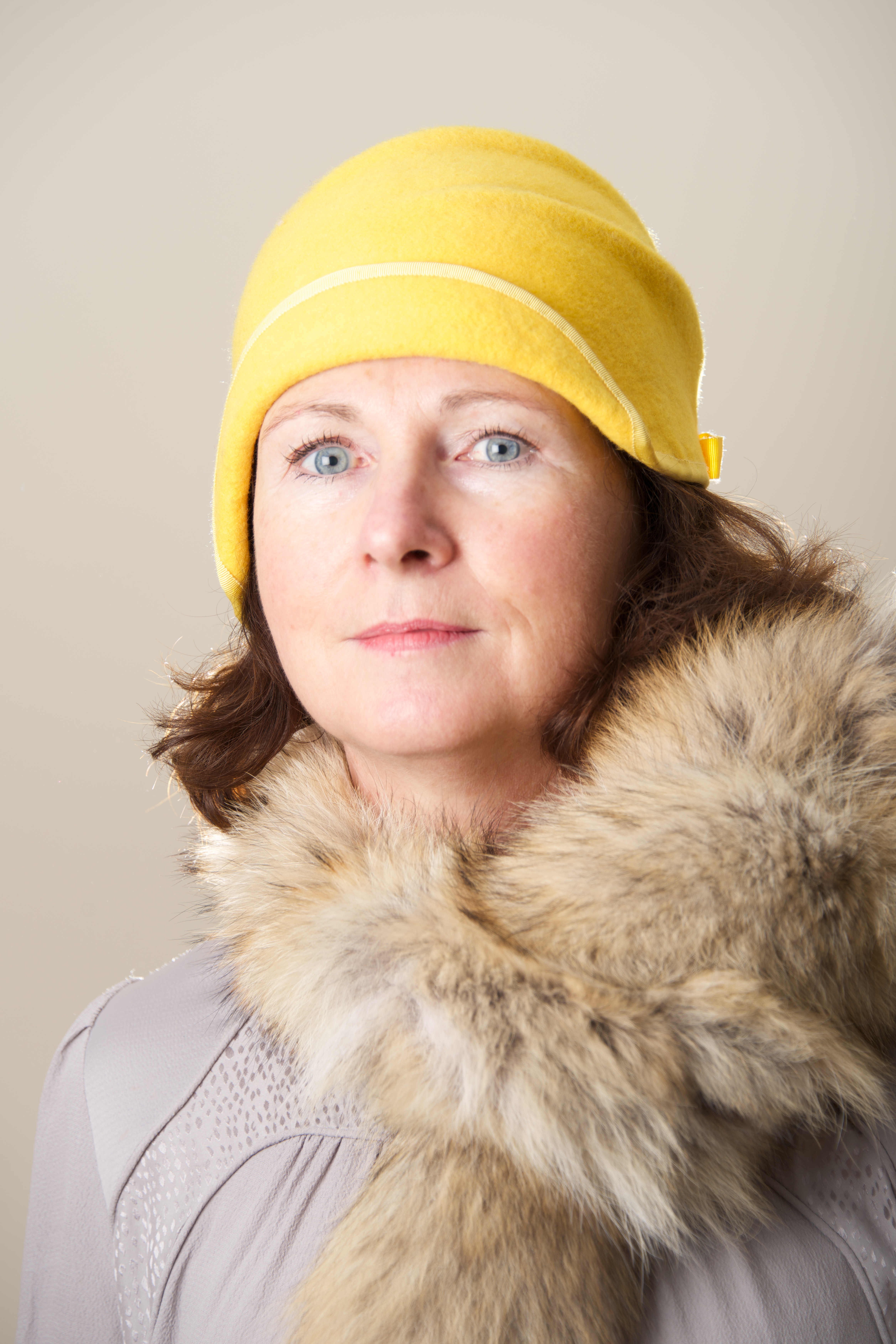 Brunette in yellow cloche hat and fur