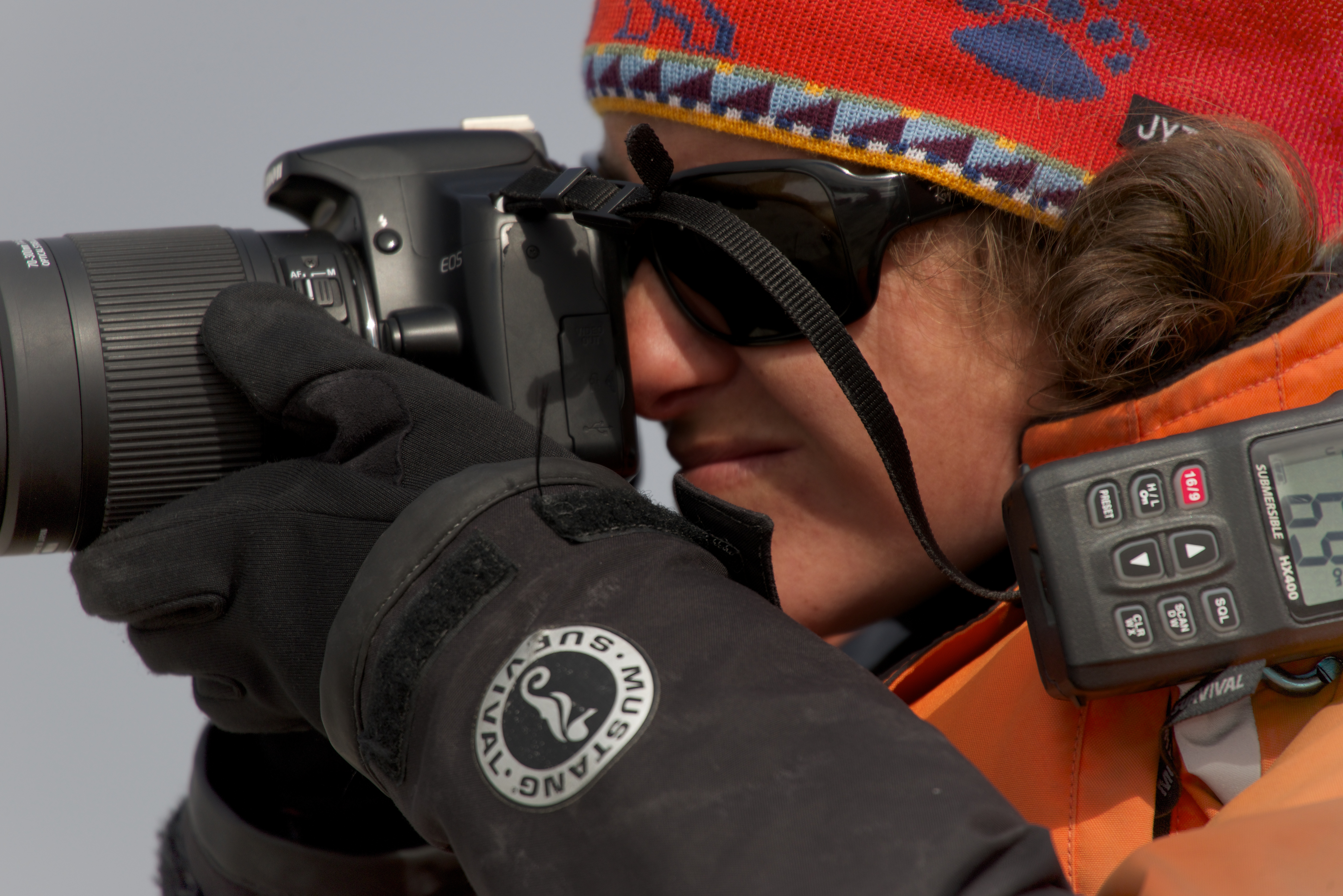 Close-up of brunette with camera and walkie-talkie