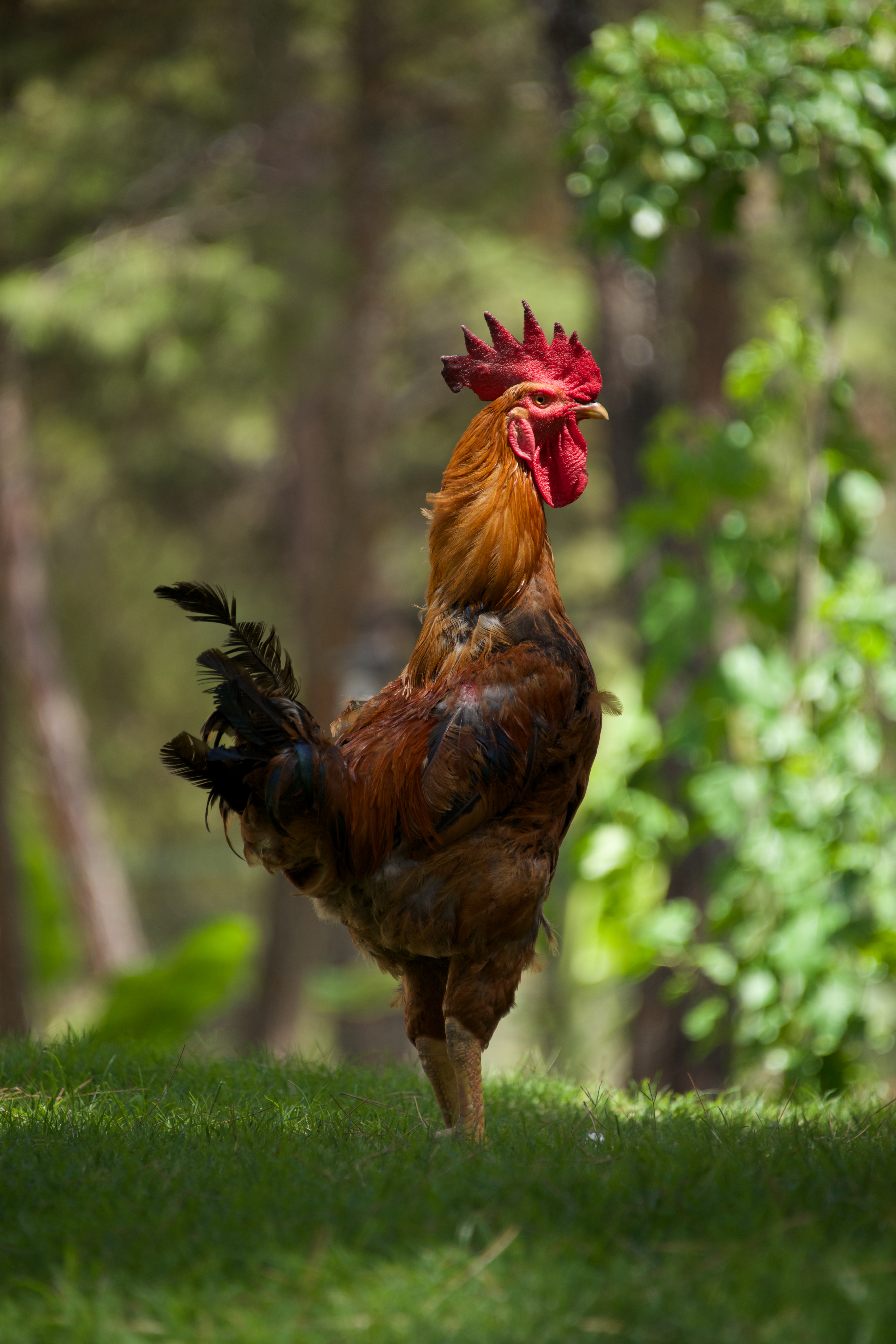 Close-up of cockerel in shaft of sunlight