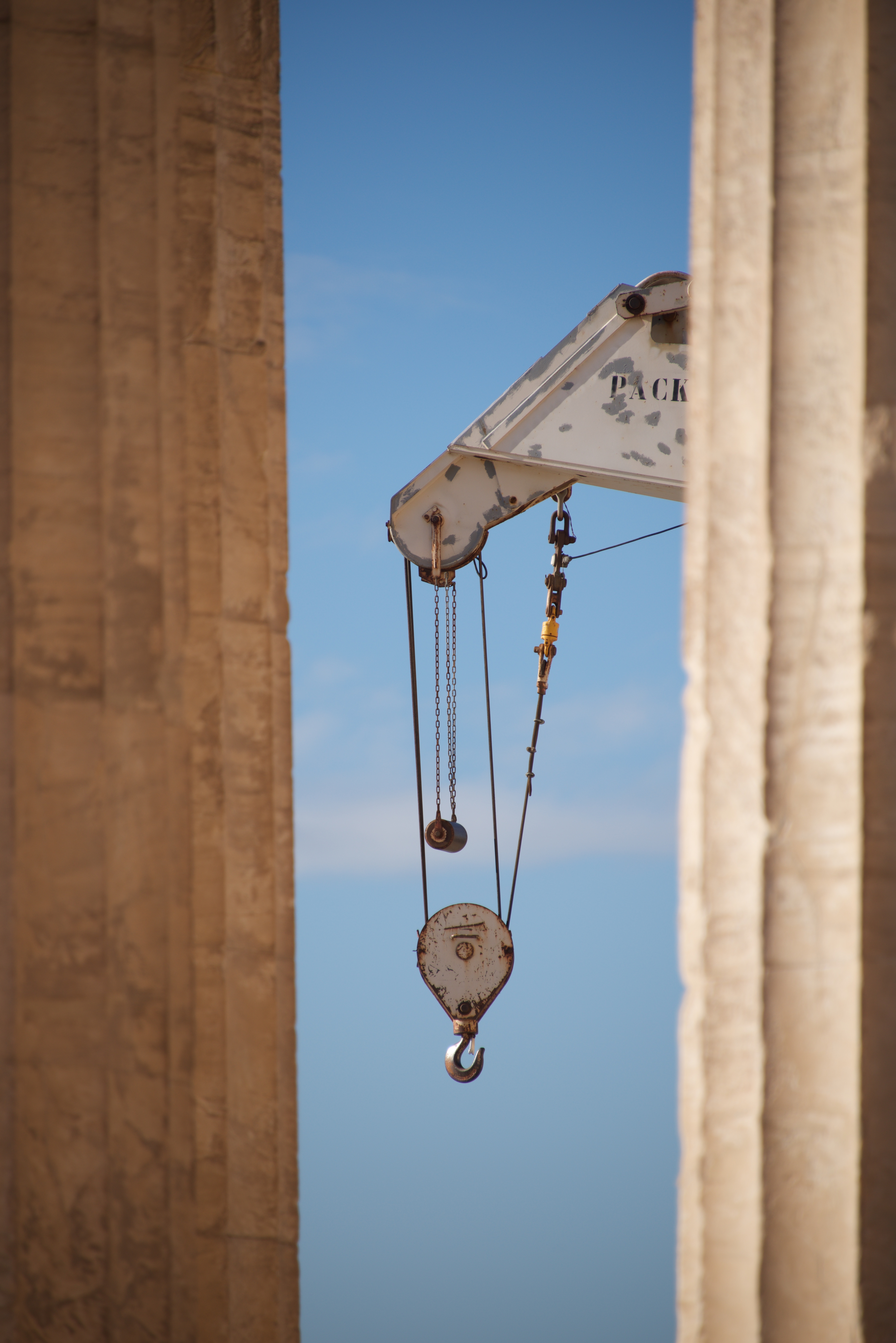 Crane appearing between two marble Parthenon columns