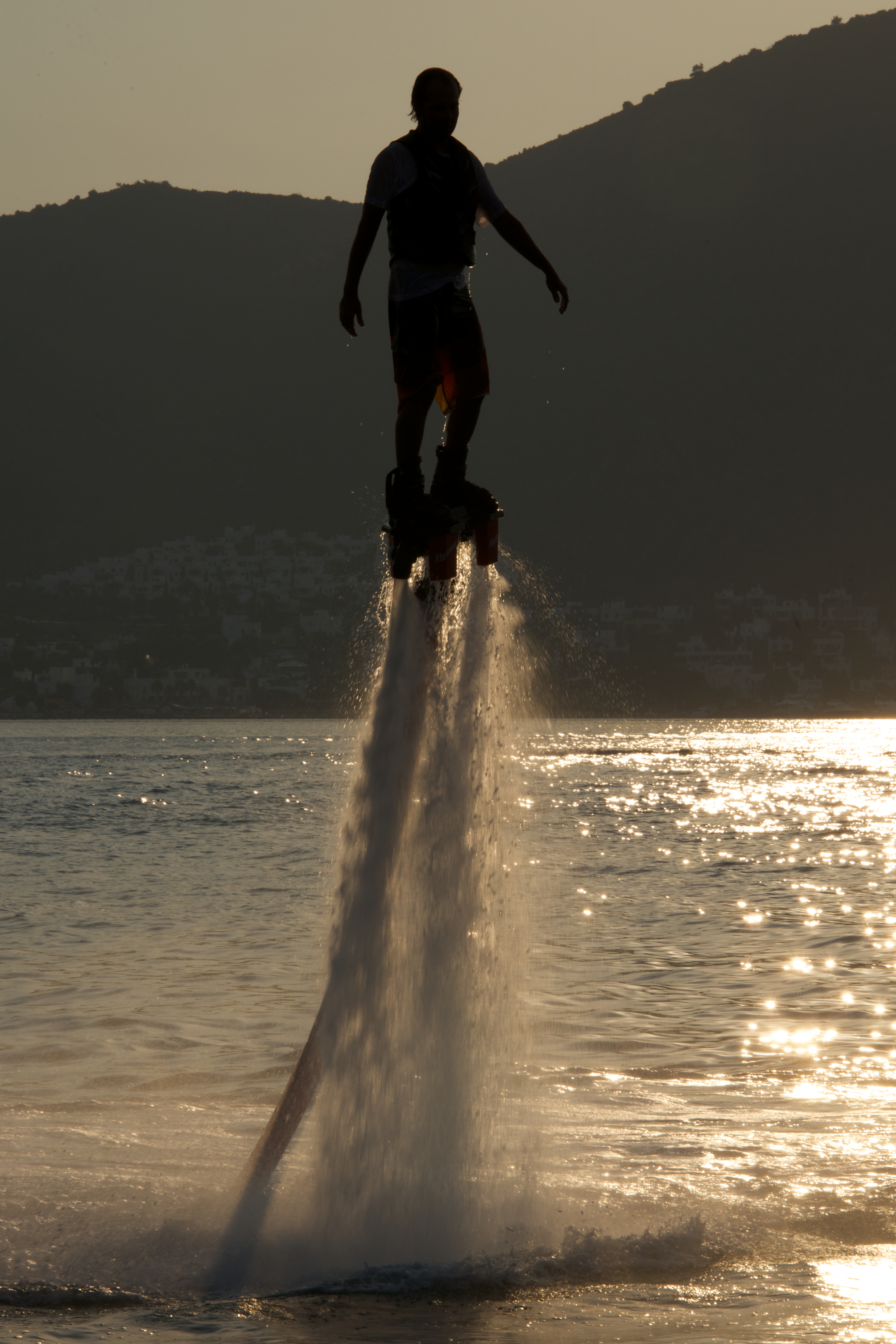 Flyboarder silhouetted at sunset beside wooded hills