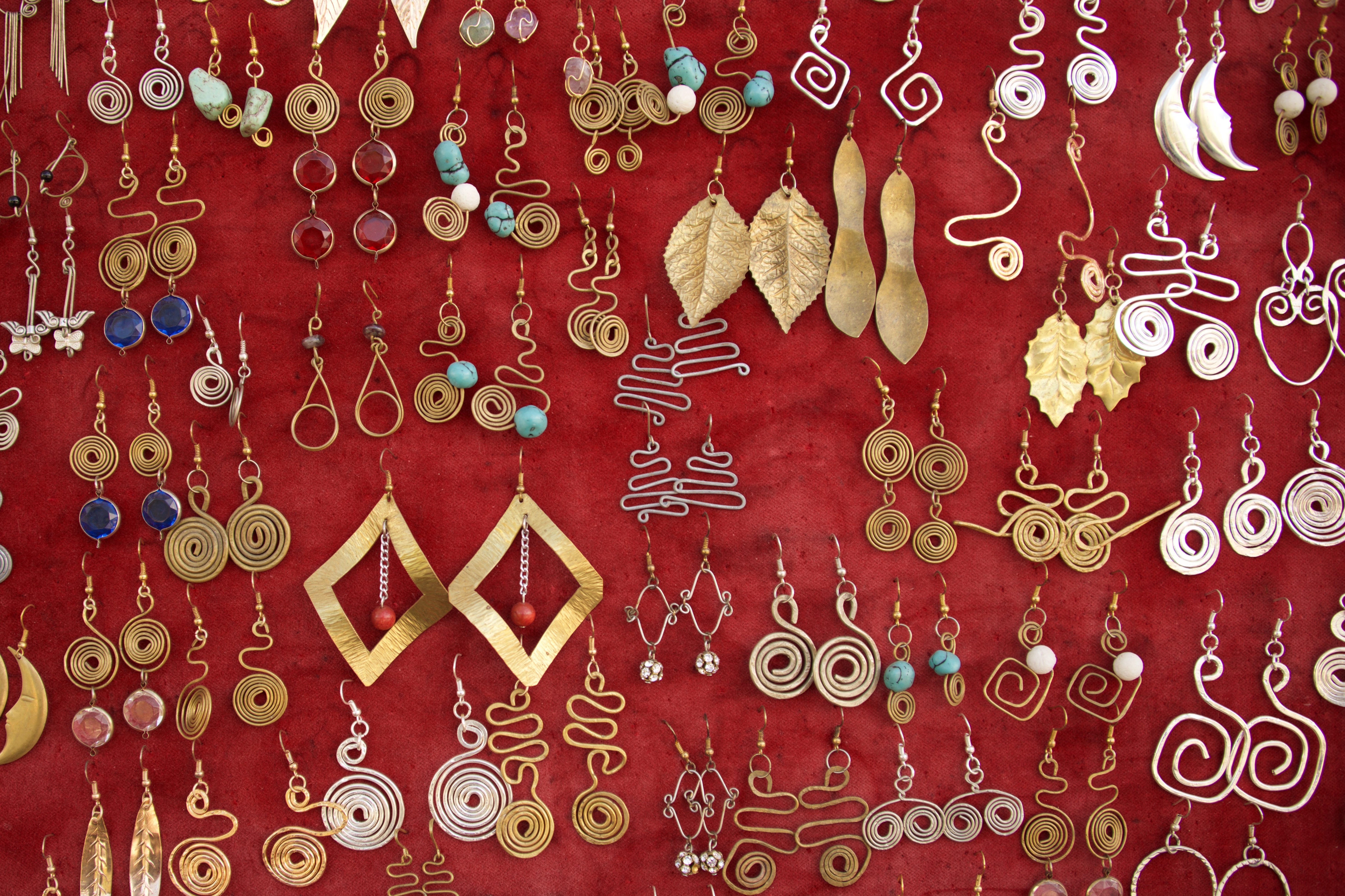 Gold and silver earrings on red velvet