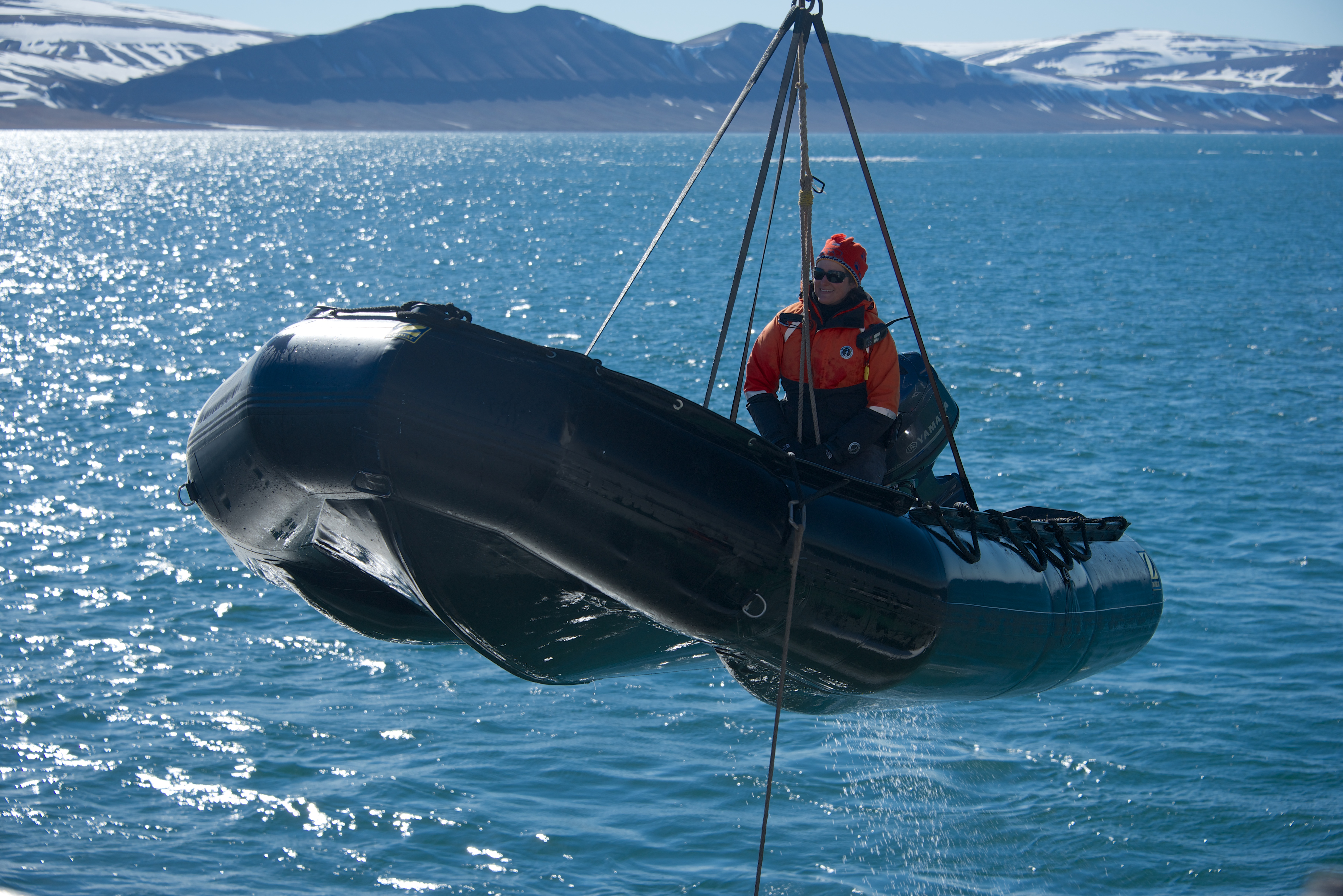 Smiling girl in inflatable hoisted over water