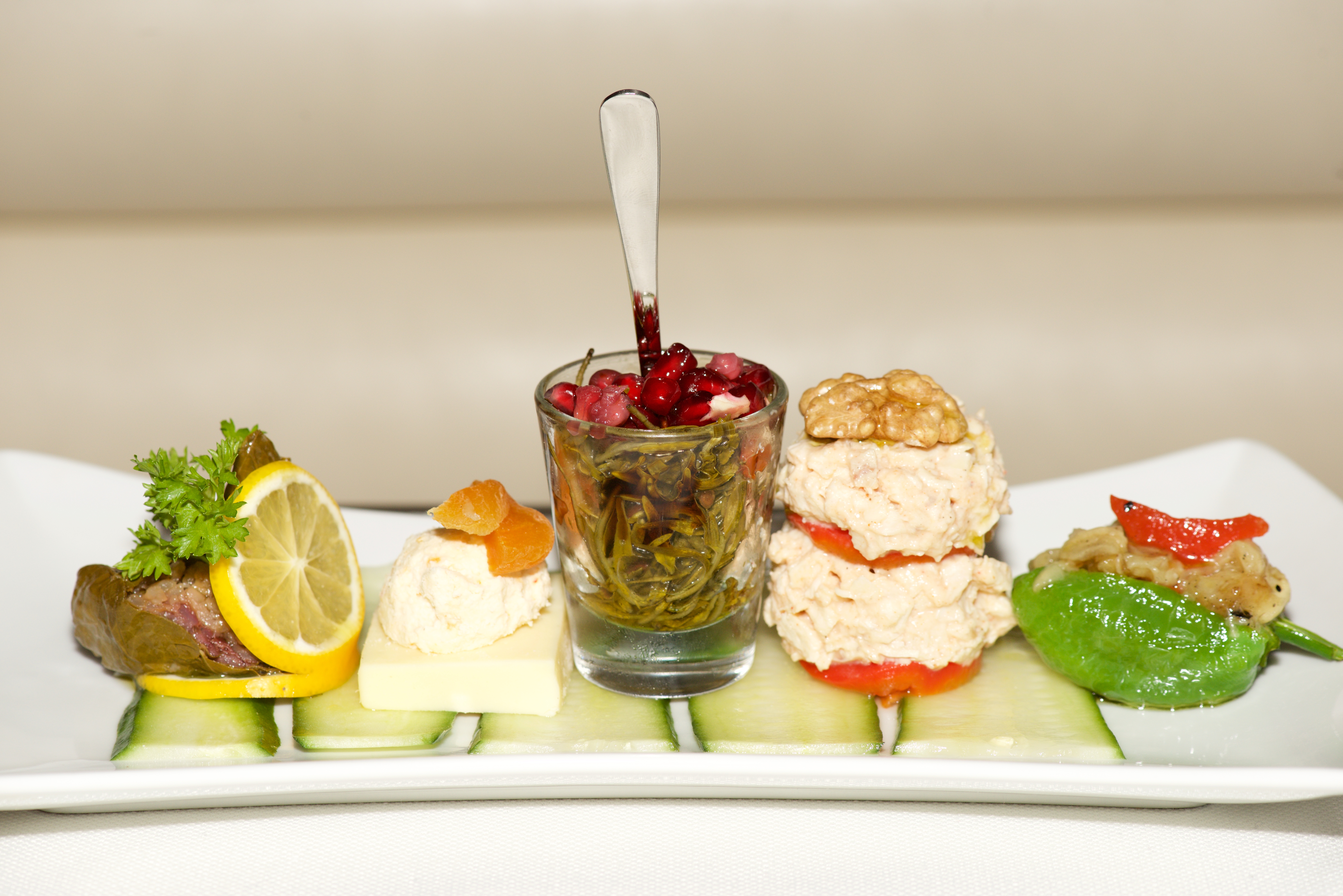 Published January 11, 2015 at 7360 × 4912 in Turkish meze selection on white china plate.