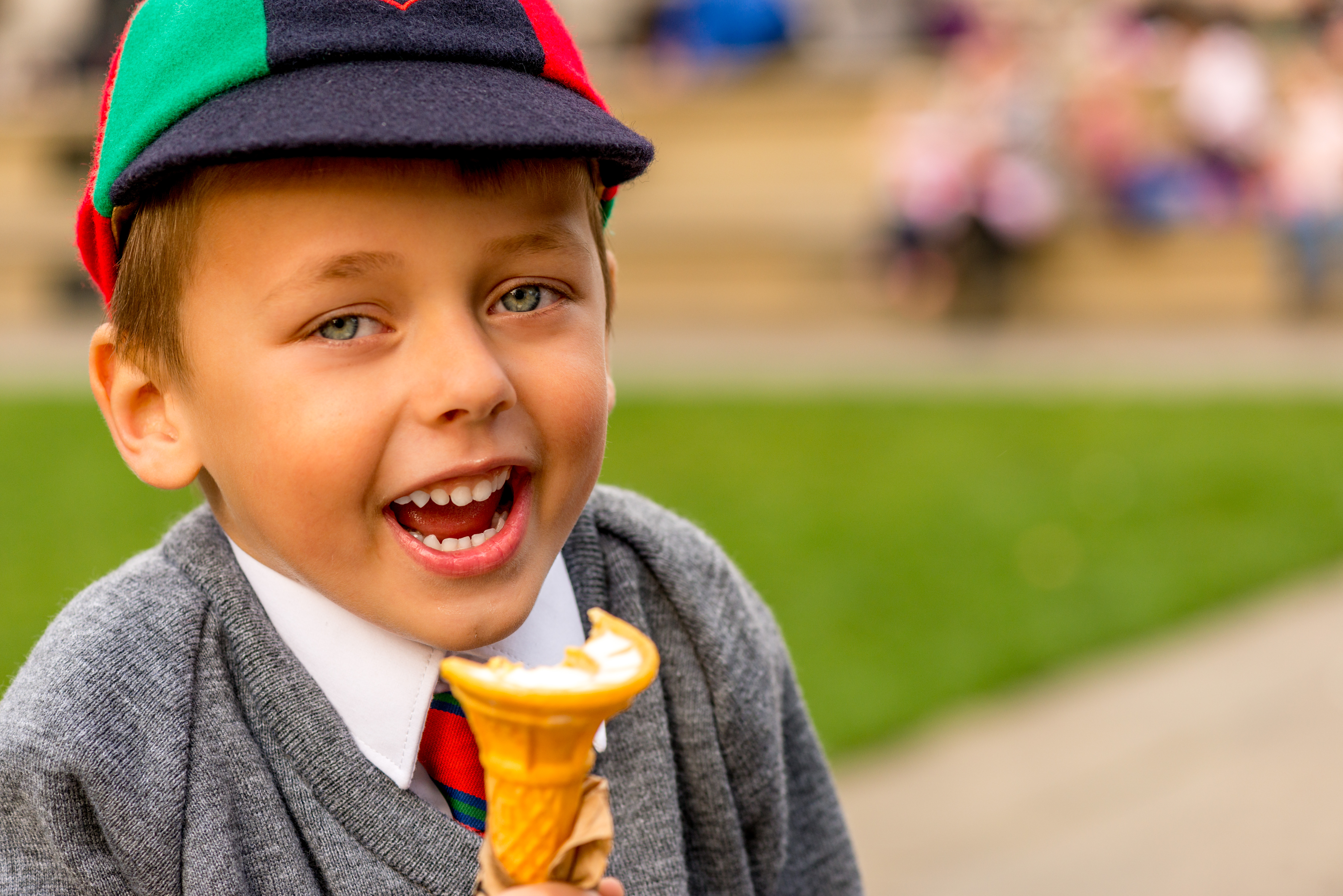 Close-up of laughing uniformed schoolboy eating ice-cream
